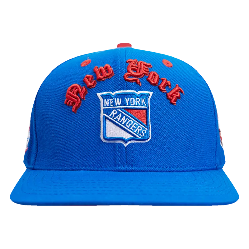 NHL NEW YORK RANGERS OLD ENGLISH UNISEX 6 PANEL SNAPBACK HAT (ROYAL BLUE)