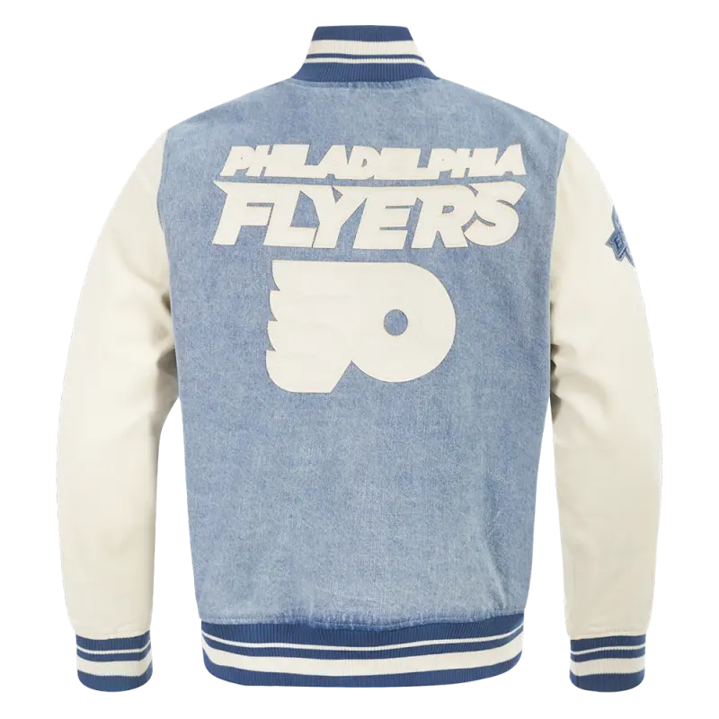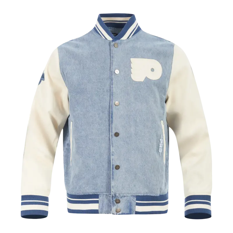 Home / Shop / JACKETS / NHL PHILADELPHIA FLYERS VARSITY BLUES MEN’S DENIM VARSITY JACKET (DENIM\/LINEN)