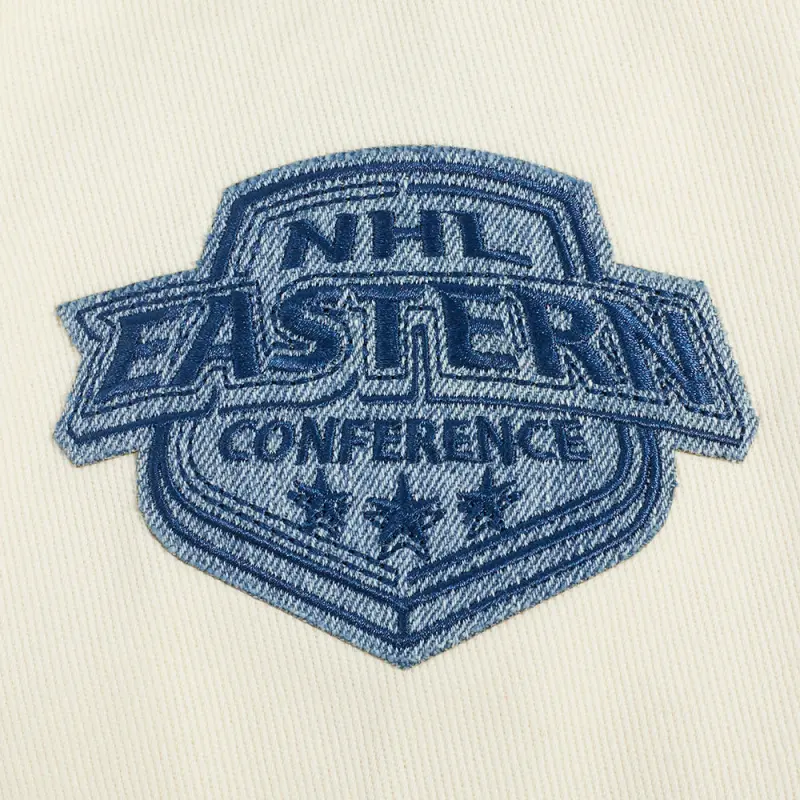 NHL PHILADELPHIA FLYERS VARSITY BLUES MEN’S DENIM VARSITY JACKET (DENIM\/LINEN)